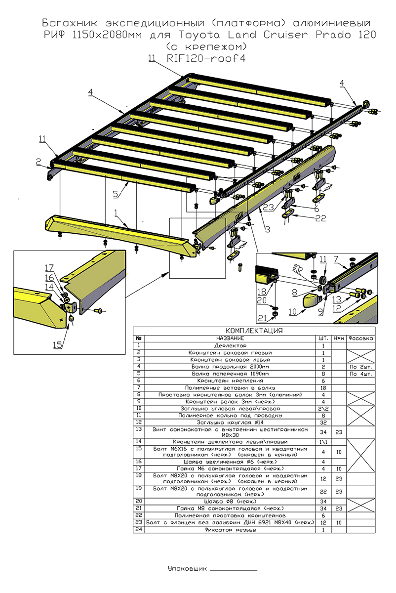 Багажник экспедиционный (платформа) алюминиевый РИФ 1150x2080 мм для Toyota Land Cruiser Prado 120 (с крепежом).