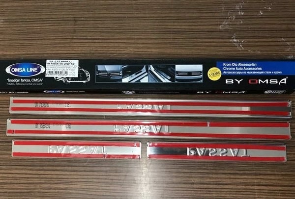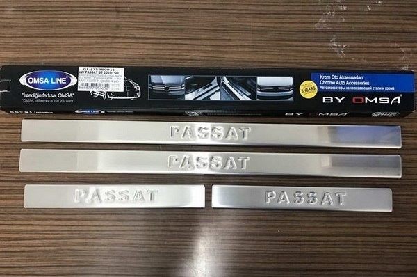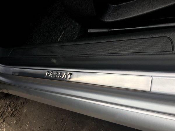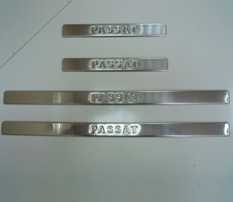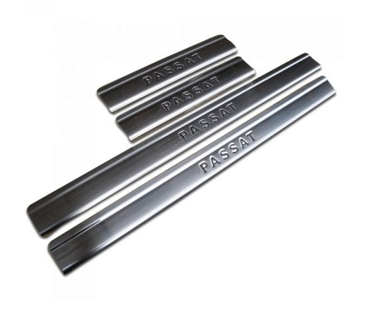 Накладки на пороги Volkswagen Passat B6 из нержавеющей стали, в комплекте 4 шт, монтируются при помощи двустороннего скотча на металл порога двери.