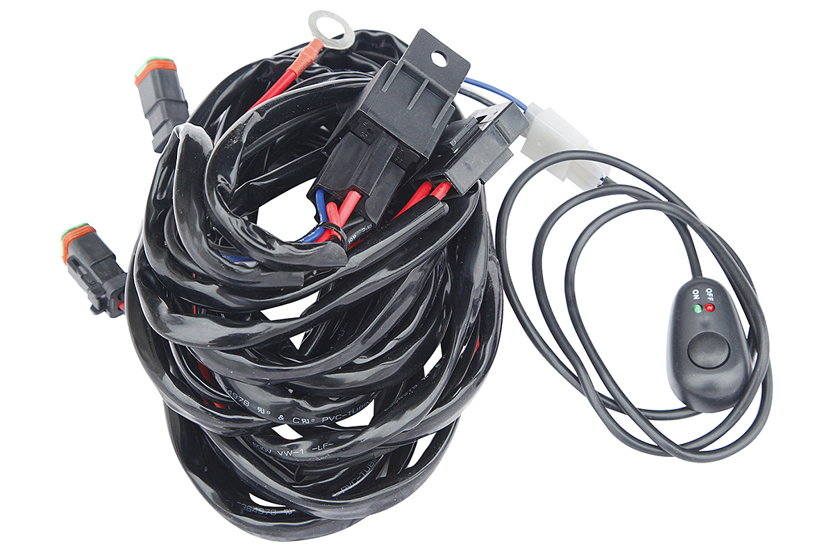 Проводка для подключения светодиодных фар Sammoon / РИФ включает в себя жгут проводов сечением 2,5 мм2, реле 40А., предохранитель 30А, выключатель с индикацией включения/выключения и 2 влагозащищённых разъёма для подключения оптики. Длина проводов от реле до первого разъёма для фар составляет 1,8м, расстояние между разъёмами для фар - 1,7м. Длина проводов от реле до выключателя 2,8.