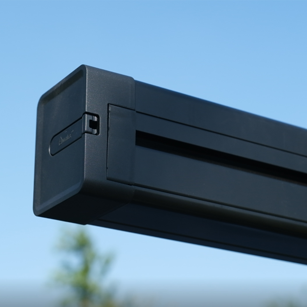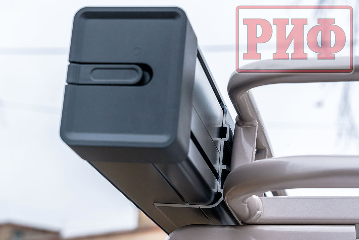 Система полуавтоматического закрытия (сборки) маркизы работает следующим образом - после того, как алюминиевые телескопические стойки и растяжки убраны, нужно чуть потянуть маркизу на себя. Тем самым отпускается стопор, фиксирующий тент в открытом положении и возвратная пружина начнет сматывать вал, на котором крепится тент.