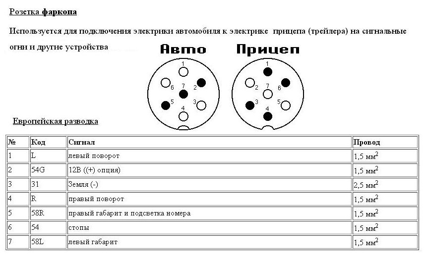 Существует два вида контактных розеток фаркопа для подключения электрооборудования прицепа: 7-ми и 13-ти контактные. Основная масса всего спецавтотранспорта (прицепы, полуприцепы и т.п.) предназначена для розеток с 7 контактами, однако 13 контактов являются более прогрессивным вариантом и отвечают требованиям современных автомобилей и прицепов. Существуют различные переходники, позволяющие Вам осуществить подключение любых "вилок" электропроводки спецавтотранспорта в любые розетки транспортного средства.