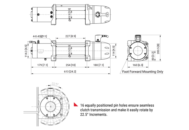 Лебедка c максимальным тяговым усилием в 5,6 тонны оснащена герметичным мотором с высоким крутящим моментом и защитой от перегрева.