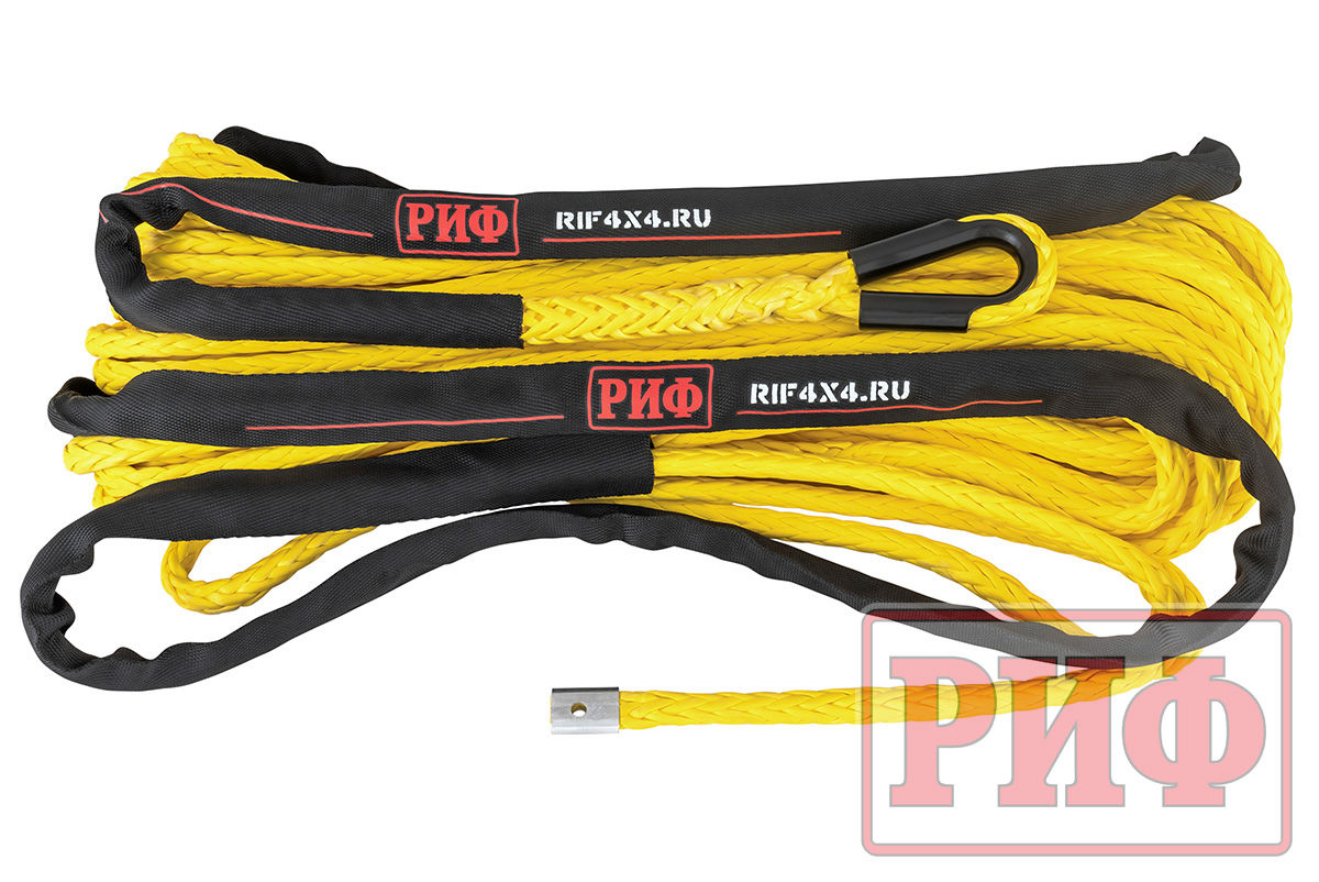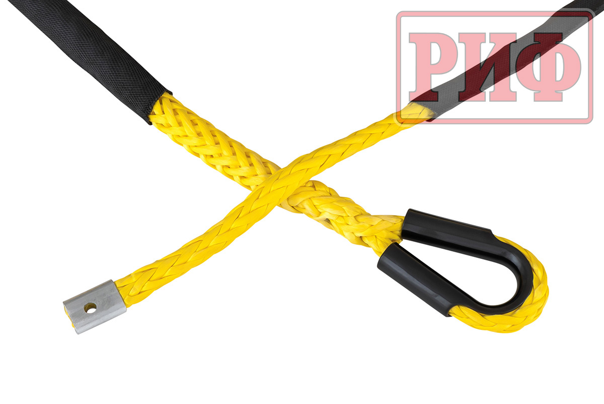 Синтетический трос РИФ изготовлен из UHMWPE(Ultrahigh molecular weight polyethylene) – полиэтилен (c ультравысокой молекулярной массой) и также прочен, как стальной, но при этом он очень легкий, износостойки и абсолютно безопасный в использовании – даже если он порвется под нагрузкой, тяжелых травм человеку и автомобилю не нанесет благодаря мягкости и маленькому весу.