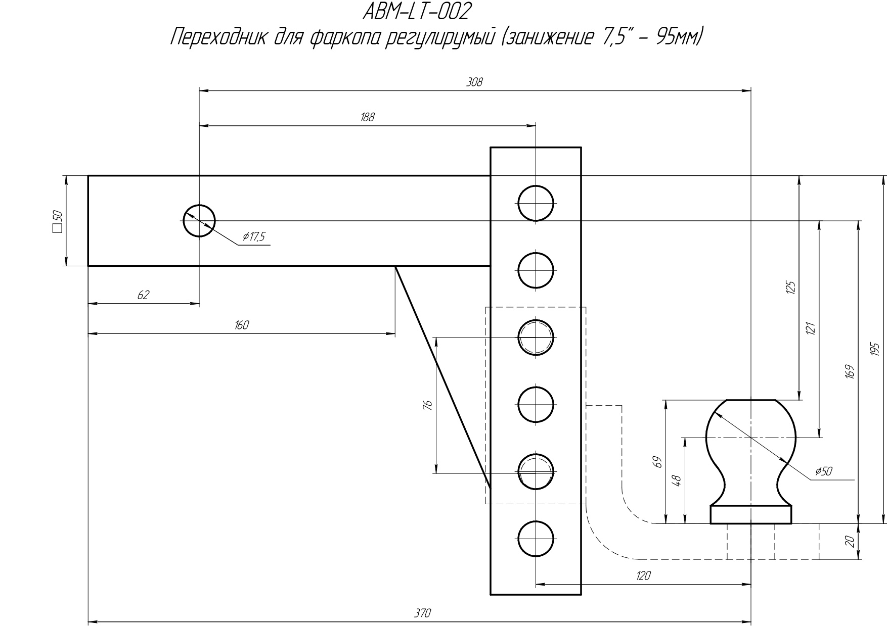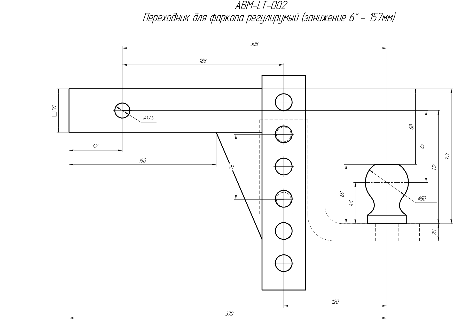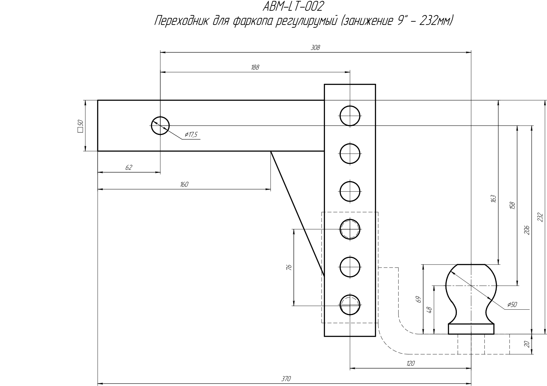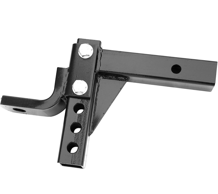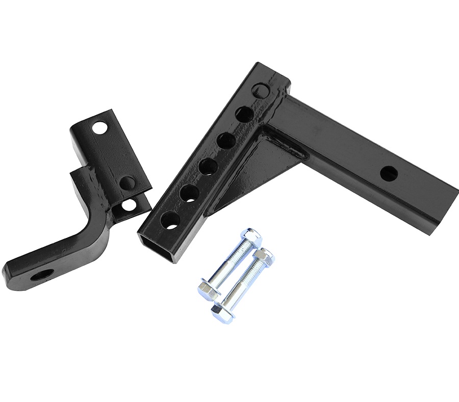 Настоящая находка для тех, кто имеет парк прицепов различной высоты. Также дает возможность компенсировать загрузку внедорожника и (или) прицепа. Нагруженная машина проседает, фаркоп становится ниже. В этом случае переходник перемещается наверх. Диапазон регулировок – от -2 до -6 дюймов относительно уровня «квадрата». Для фиксации подвижной части фаркопа используется крепежный «палец» стандартного размера.Переходник окрашен черной порошковой краской, стойкой к коррозии даже в городских условиях. Материал – сталь. Толщина стенок труб – 5 мм, площадки – 19 мм.