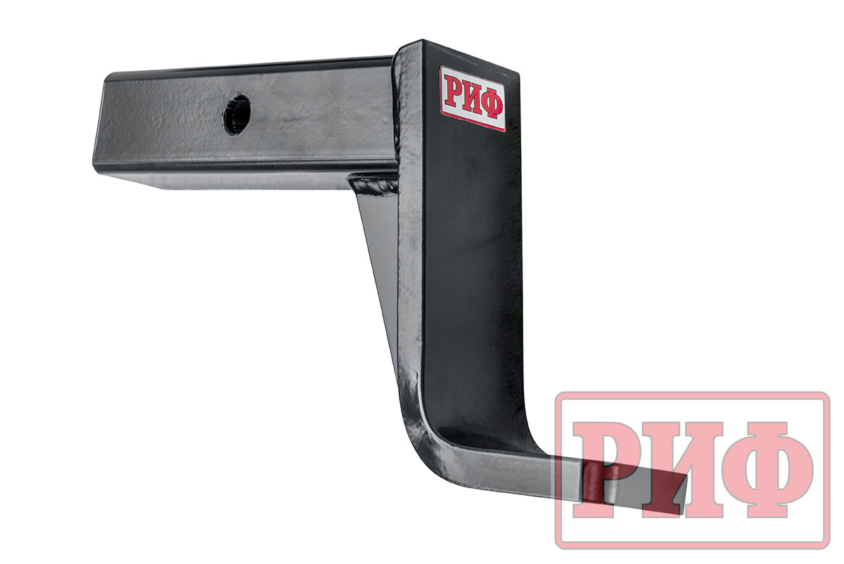 Переходник РИФ для фаркопа сделан из квадратной стальной трубы с толщиной стенок 5 мм. В месте крепления пластины шара к трубе вварен усилитель. Переходник подходит под популярное крепление типа «американский квадрат» (5х5 см). В переходнике сделано отверстие под стандартный крепежный «палец».