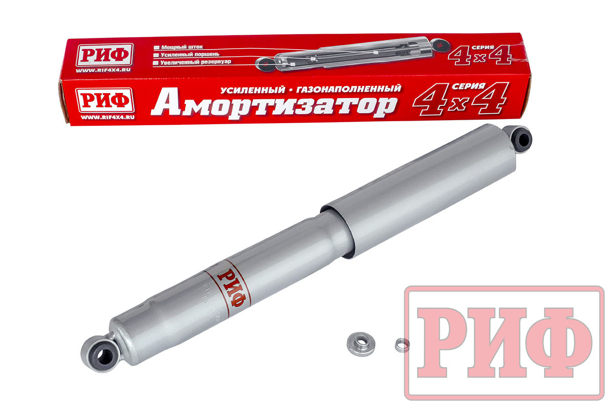 Гидравлические амортизаторы "РИФ" с газовым подпором. Газ, находящийся под давлением в компенсационной камере наружной трубы, позволяет повысить устойчивость амортизатора к высоким нагрузкам. Масло под давлением газа менее подвержено эффекту кавитации, а значит и меньше вспенивается, в отличие от обычного гидравлического амортизатора. Также, благодаря увеличенному масляному резервуару с большим количеством масла, усиленному штоку и поршню, амортизаторы "РИФ" обладают длительным рабочим ресурсом и обеспечивают великолепную стабильность рабочих характеристик при длительной езде по дорогам общего пользования, отличную курсовую устойчивость, хорошую артикуляцию подвески и приятную плавность хода на бездорожье.