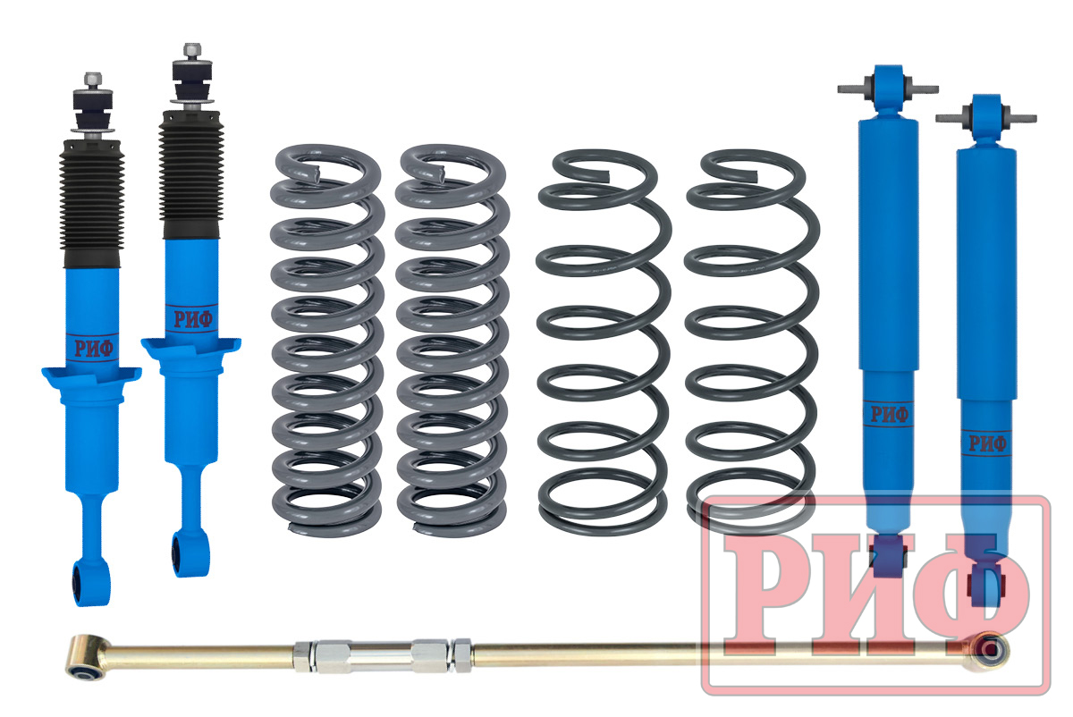 Все компоненты лифт-комплектов РИФ разработаны специально для эксплуатации внедорожника в тяжелых условиях на различных дорожных покрытиях. Амортизаторы с технологией R-AIR и пружины РИФ не только компенсируют вес установленного на внедорожнике дополнительного оборудования (бамперов, порогов, дополнительных топливных баков, лебедок и прочего), но также существенно повышают грузоподъемность автомобиля.