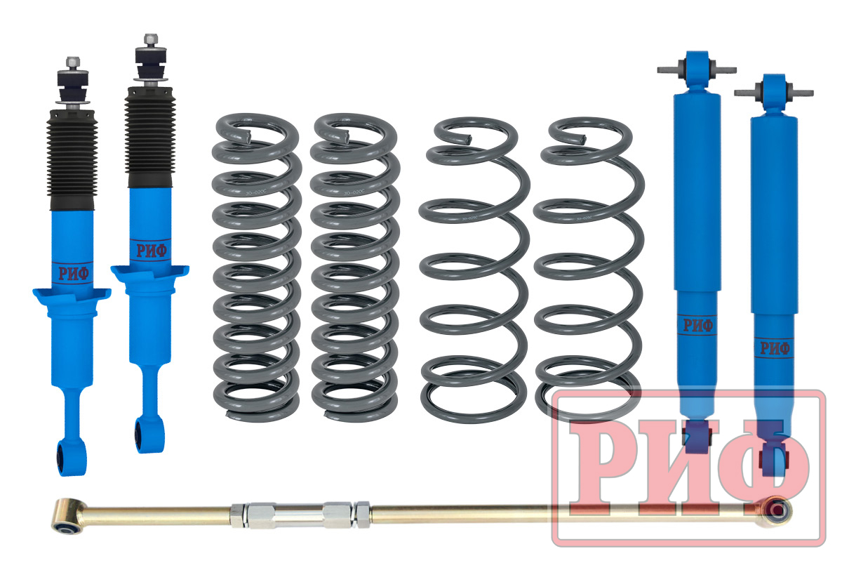 Все компоненты лифт-комплектов РИФ разработаны специально для эксплуатации внедорожника в тяжелых условиях на различных дорожных покрытиях. Амортизаторы с технологией R-AIR и пружины РИФ не только компенсируют вес установленного на внедорожнике дополнительного оборудования (бамперов, порогов, дополнительных топливных баков, лебедок и прочего), но также существенно повышают грузоподъемность автомобиля.