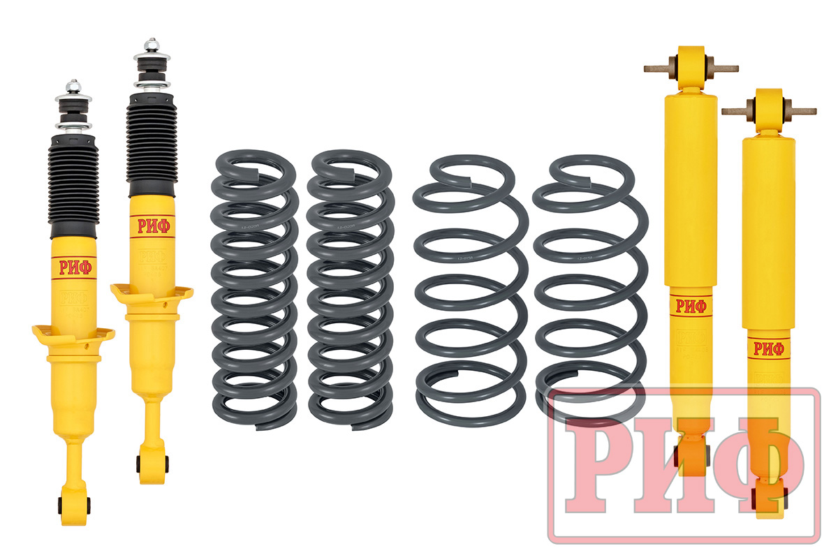Все компоненты лифт-комплектов РИФ разработаны специально для эксплуатации внедорожника в тяжелых условиях на различных дорожных покрытиях. Амортизаторы с технологией R-AIR и пружины РИФ не только компенсируют вес установленного на внедорожнике дополнительного оборудования (бамперов, порогов, дополнительных топливных баков, лебедок и прочего), но также существенно повышают грузоподъемность автомобиля.