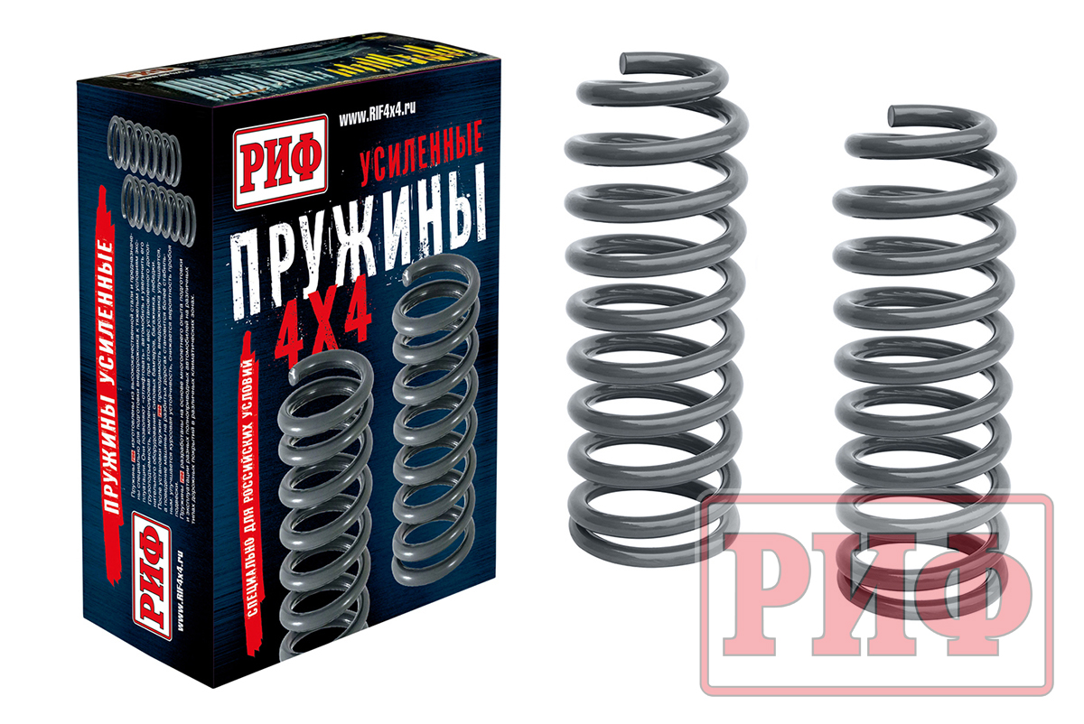 Пружины РИФ изготовлены из высококачественной конструкционной стали и предназначены специально для подготовки внедорожника к тяжелым условиям эксплуатации. Они позволяют «отлифтовать» внедорожник и увеличить его грузоподъемность, компенсировав при этом вес установленного дополнительного оборудования – силовых бамперов, багажника, лебедки.