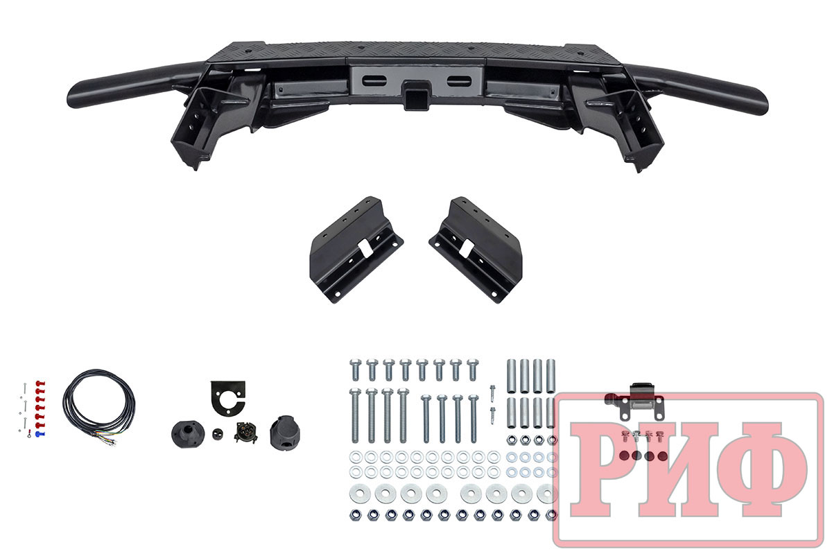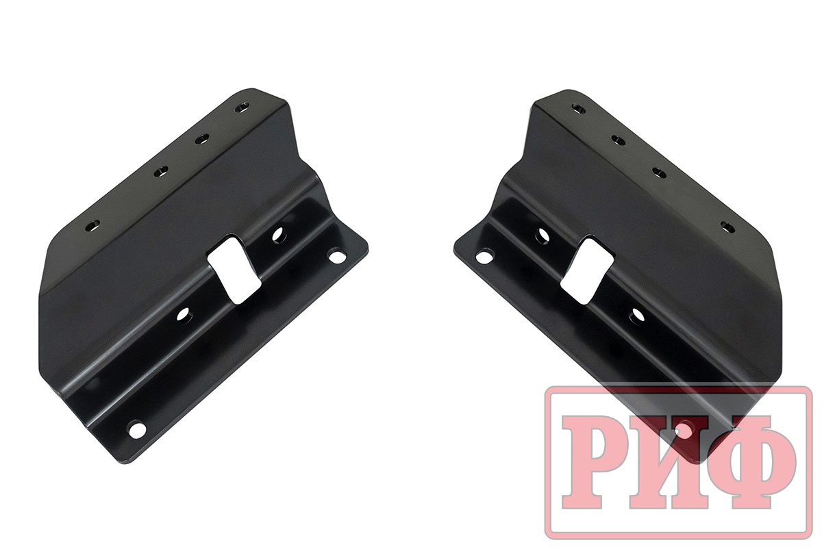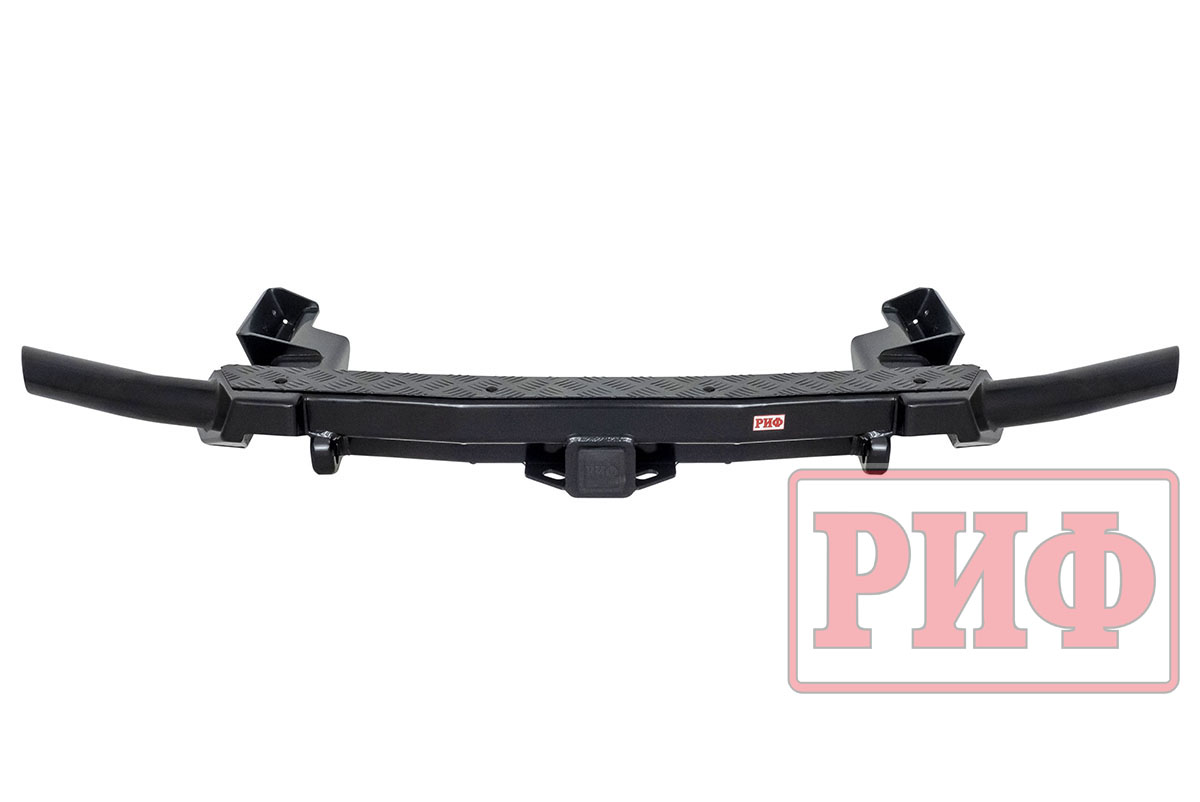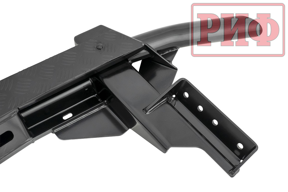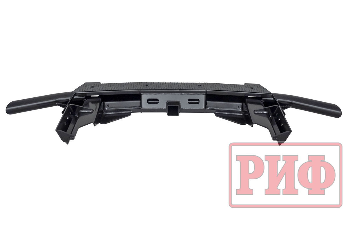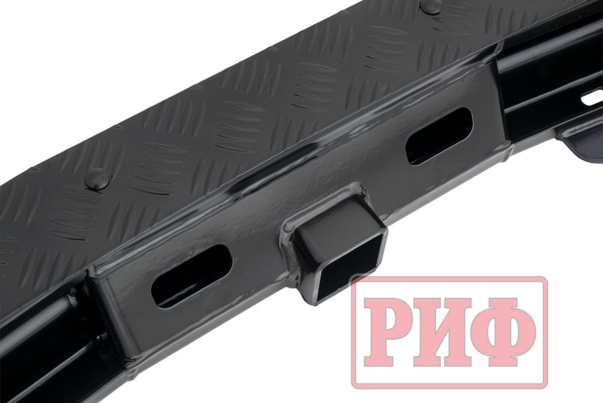 Задний силовой бампер РИФ надежно защитит кузов автомобиля на бездорожье или в городе в случае непредвиденных инцидентов. Бампер оборудован упорами под хай джек и буксирными проушинами для работы с рывковой или буксировочной стропой. Встроенный американский "квадрат" позволяет использовать любые съемные фаркопы, переходники, буксировочные устройства или съемные площадки для лебедки.