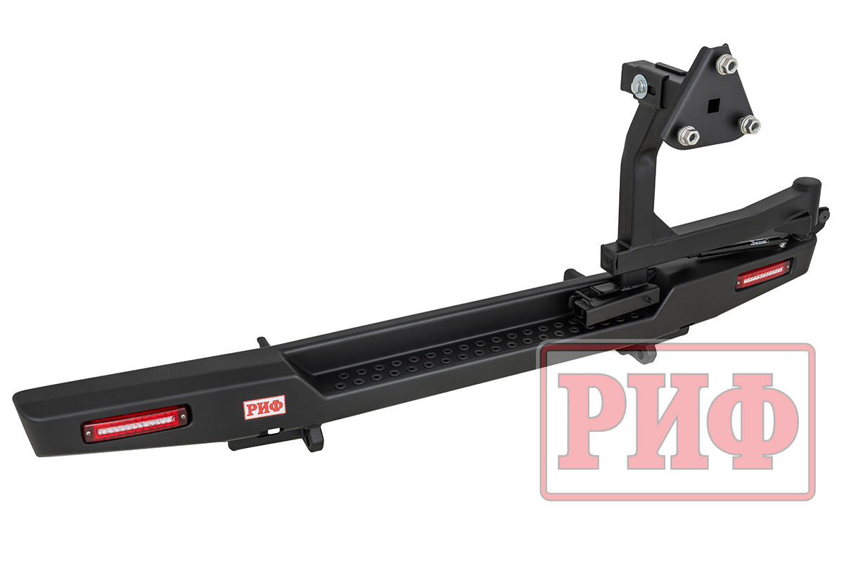Задний силовой бампер РИФ надежно защитит кузов автомобиля на бездорожье или в городе в случае непредвиденных инцидентов. Бампер оборудован упорами под хай джек и буксирными проушинами для работы с рывковой или буксировочной стропой.