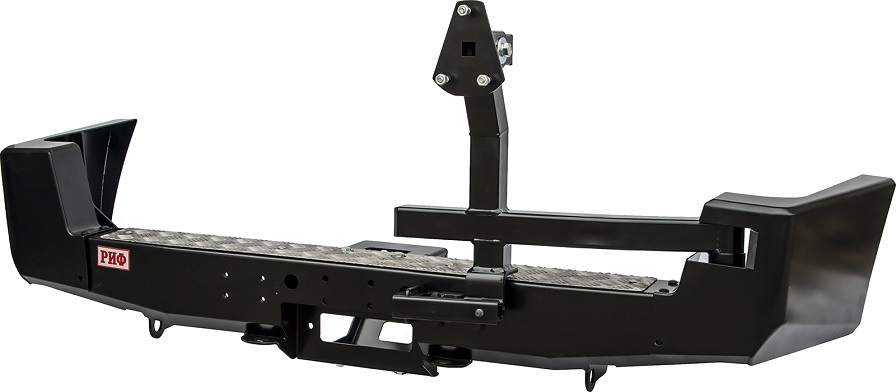 Задний силовой бампер от производителя РИФ с площадкой под лебедку и возможностью установки калитки под запасное колесо для внедорожника устанавливается на автомобиль без его переделок и обеспечивает качественную и надежную защиту задней части внедорожника.
