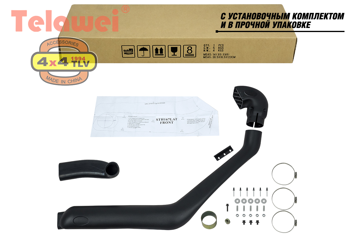 Шноркель Telawei , китайский шноркель - это труба-воздухозаборник необходимая для форсирования водных преград и предназначенная для защиты двигателя от попадания воды и предохраняющая его от гидроудара. Также китайский шноркель уменьшает загрязнение воздушного фильтра при езде по песку и пыльным дорогам. Шноркель Telawei, китайский шноркель - обязательный атрибут Вашего внедорожника. Китайский шноркель Telawei не уступает по качеству изготовления таким брендам как Safari Snorkel, TJM Snorkel которые произведены в Австралии.