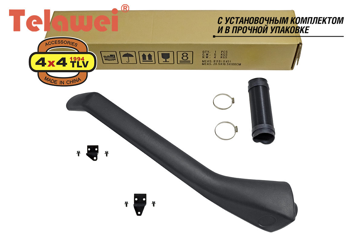 Шноркель Telawei , китайский шноркель - это труба-воздухозаборник необходимая для форсирования водных преград и предназначенная для защиты двигателя от попадания воды и предохраняющая его от гидроудара. Также китайский шноркель уменьшает загрязнение воздушного фильтра при езде по песку и пыльным дорогам. Шноркель Telawei, китайский шноркель - обязательный атрибут Вашего внедорожника. Китайский шноркель Telawei не уступает по качеству изготовления таким брендам как Safari Snorkel, TJM Snorkel которые произведены в Австралии.