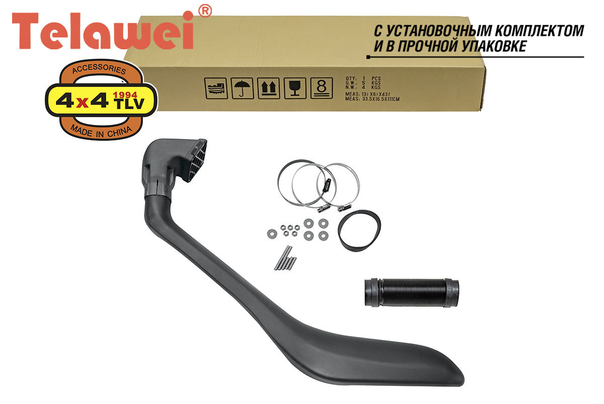 Шноркель Telawei , китайский шноркель - это труба-воздухозаборник необходимая для форсирования водных преград и предназначенная для защиты двигателя от попадания воды и предохраняющая его от гидроудара. Также китайский шноркель уменьшает загрязнение воздушного фильтра при езде по песку и пыльным дорогам. Шноркель Telawei, китайский шноркель - обязательный атрибут Вашего внедорожника. Китайский шноркель Telawei не уступает по качеству изготовления таким брендам как Safari Snorkel, TJM Snorkel которые произведены в Австралии.